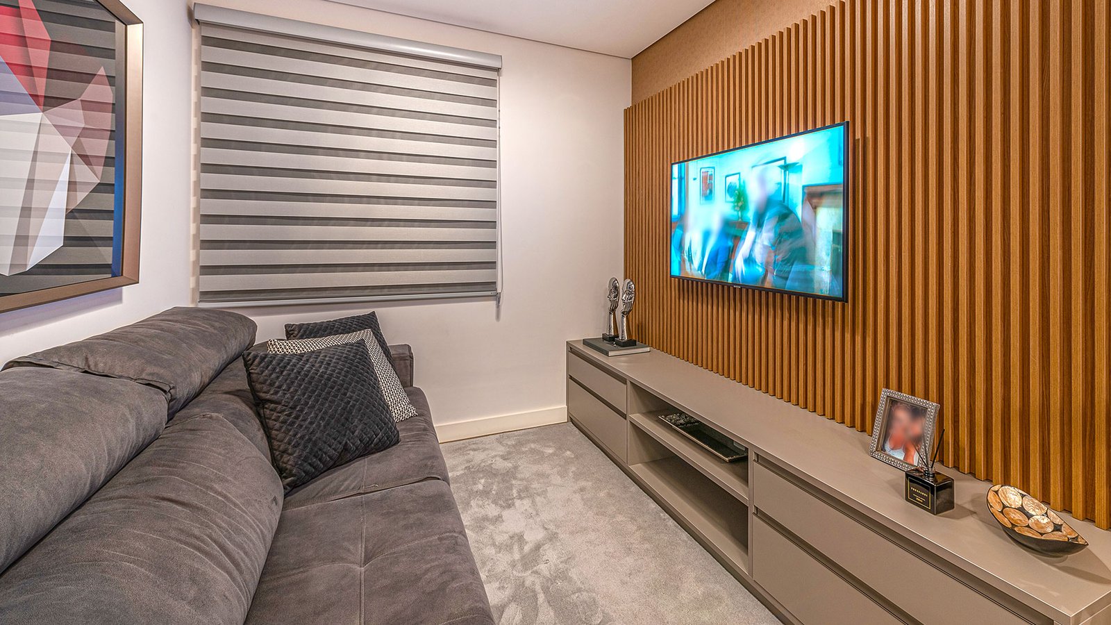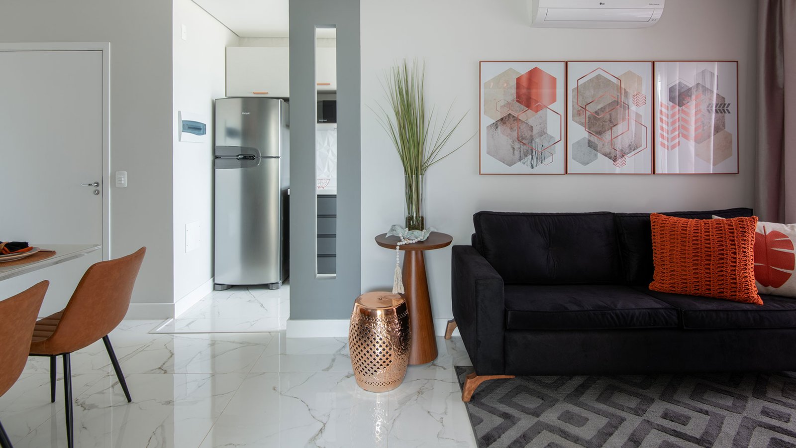 Sala de apartamento com estofados e decorações escolhidos pela designer de interiores Thaísa Soares.