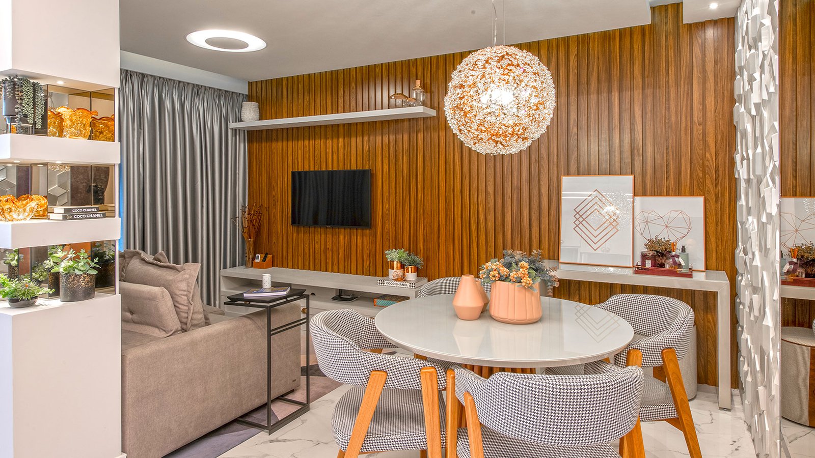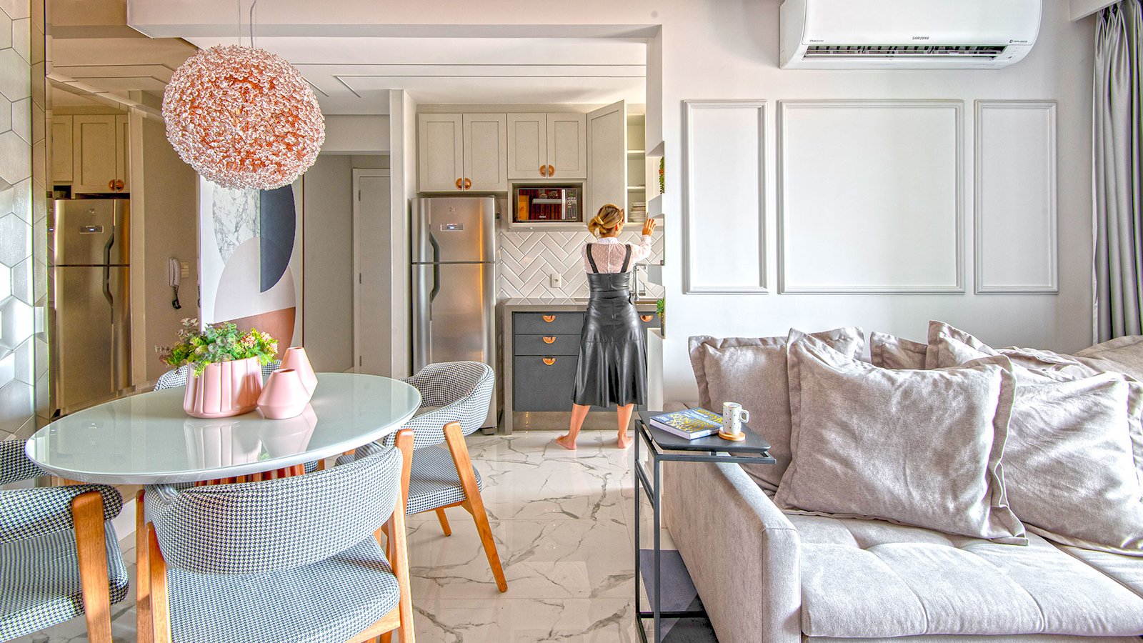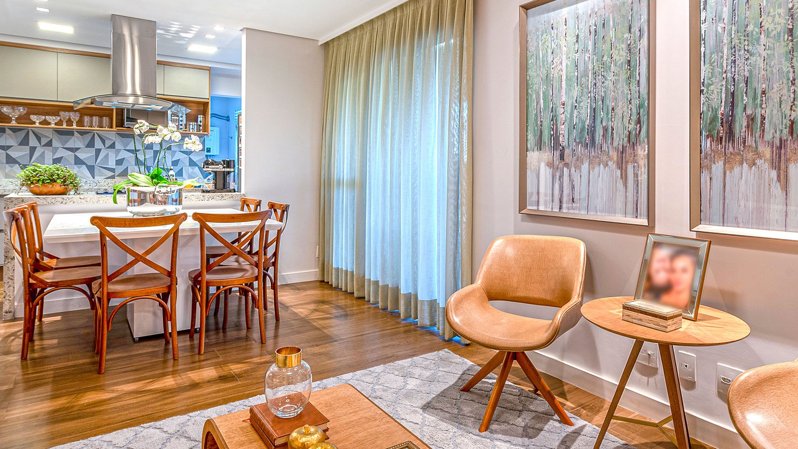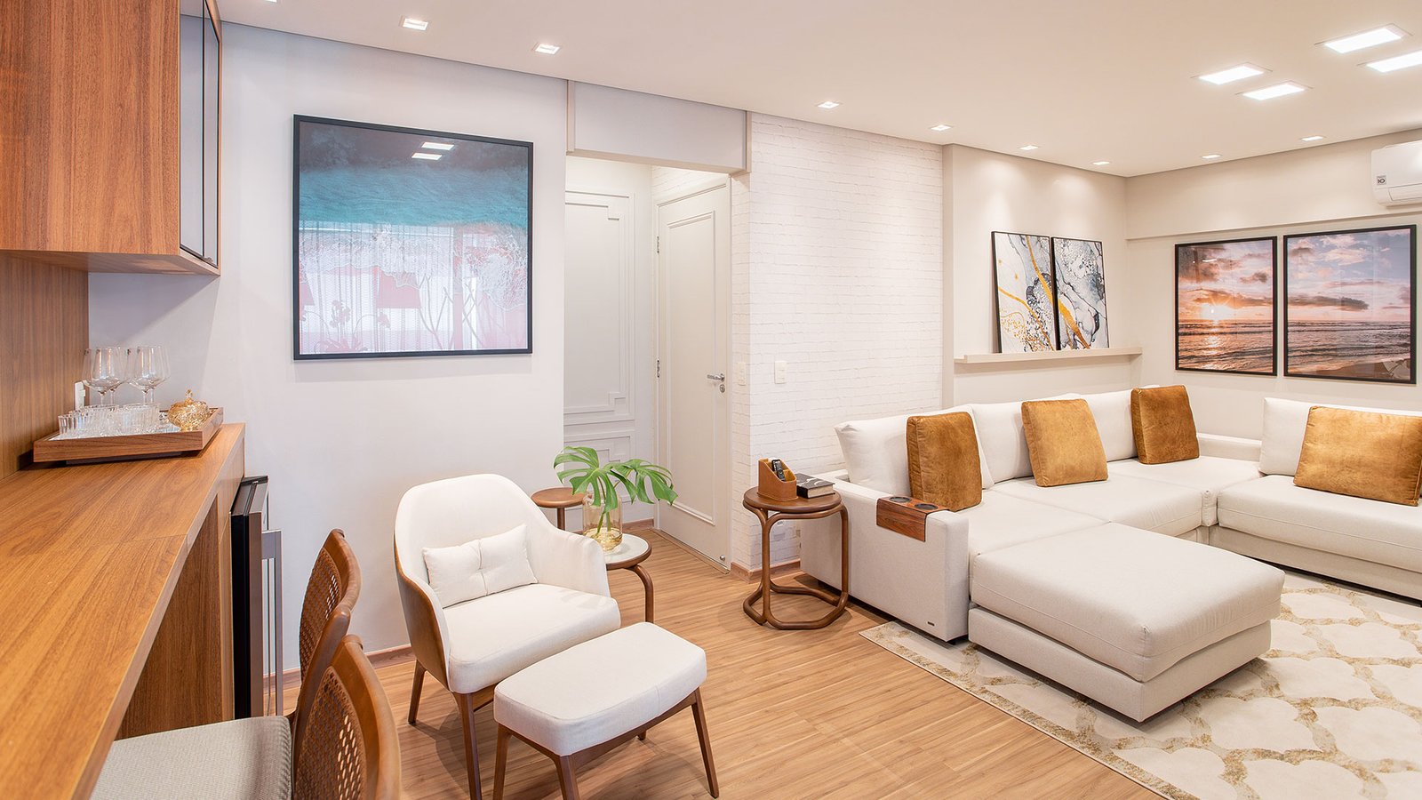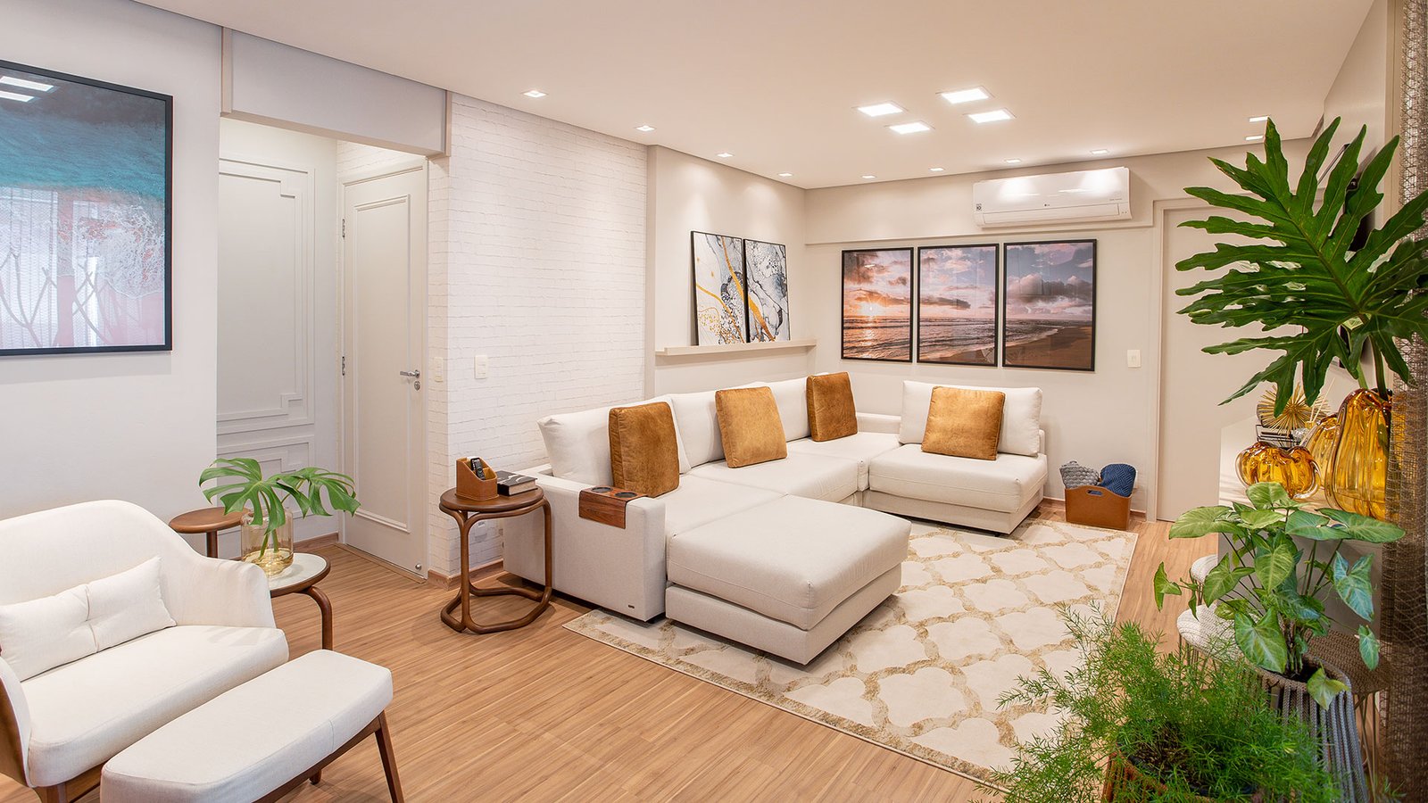 Sala de apartamento com estofados e decorações escolhidos pela designer de interiores Thaísa Soares.