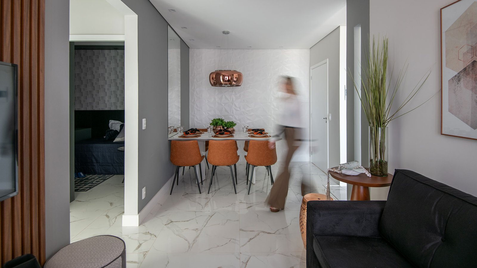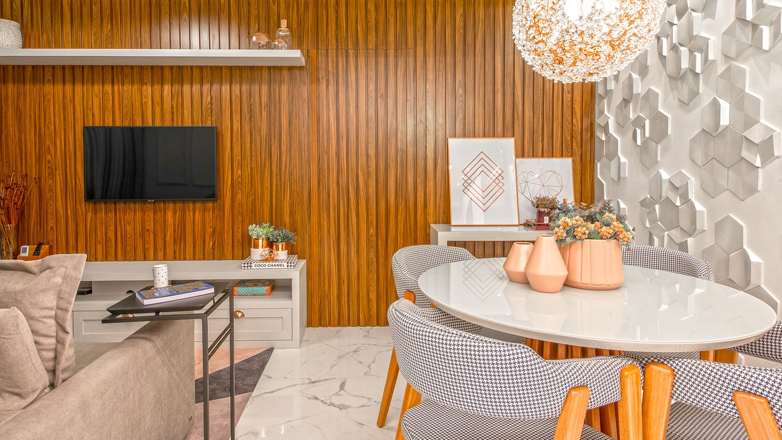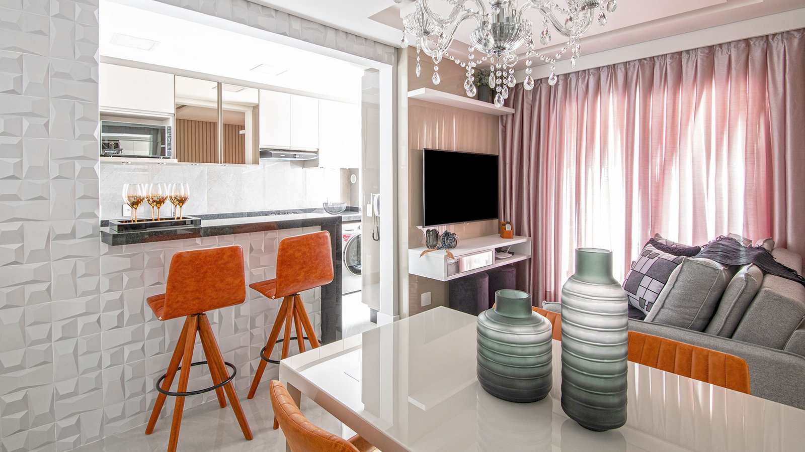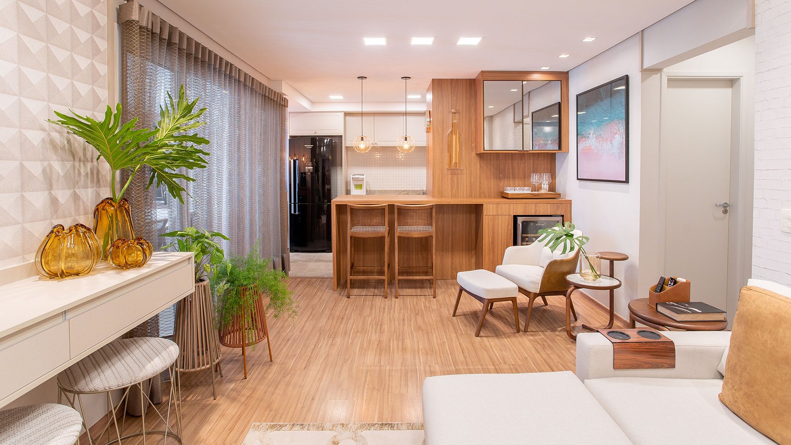 Sala de apartamento com estofados e decorações escolhidos pela designer de interiores Thaísa Soares.