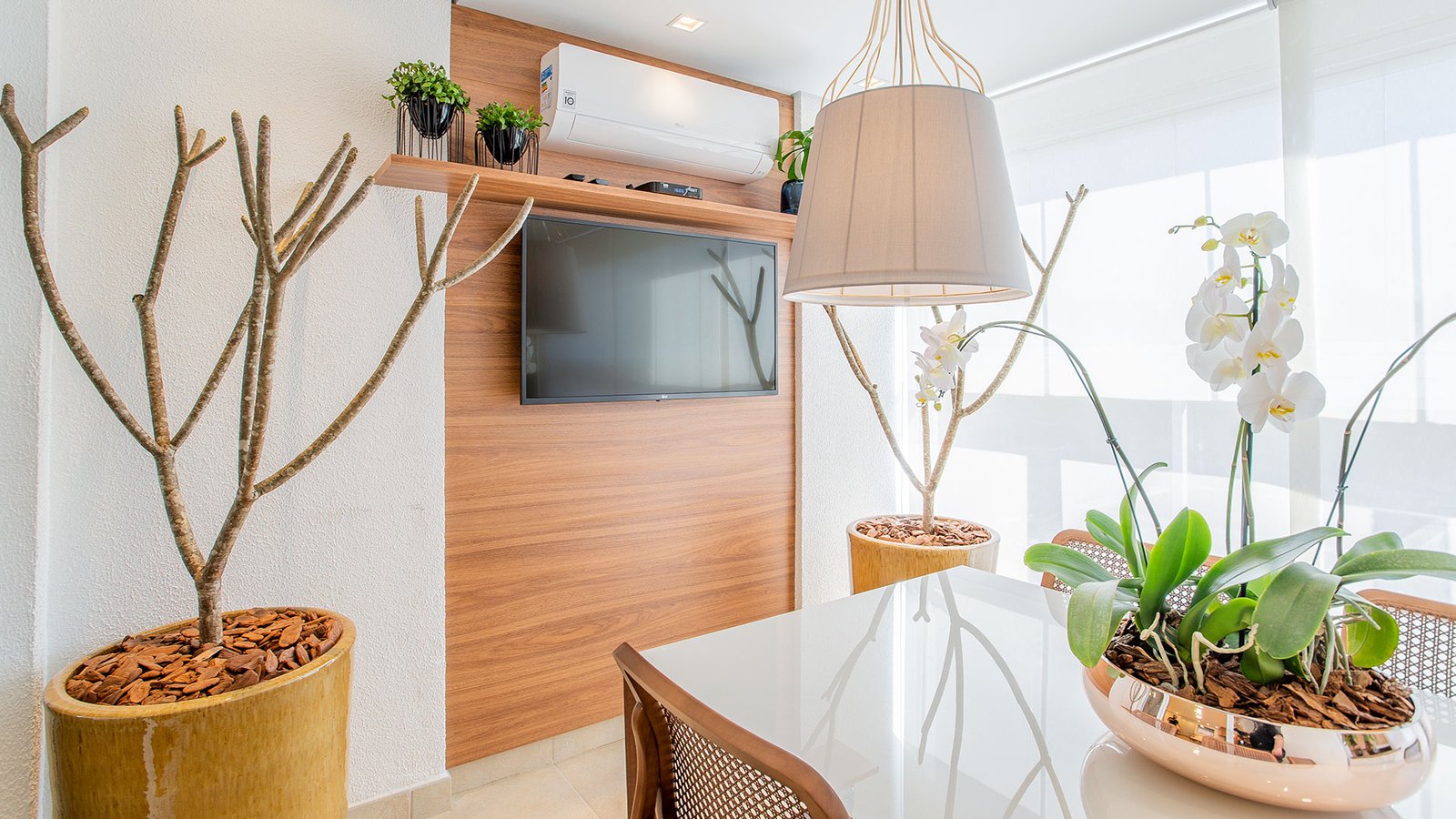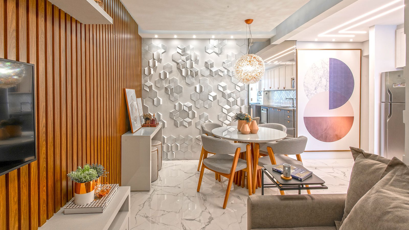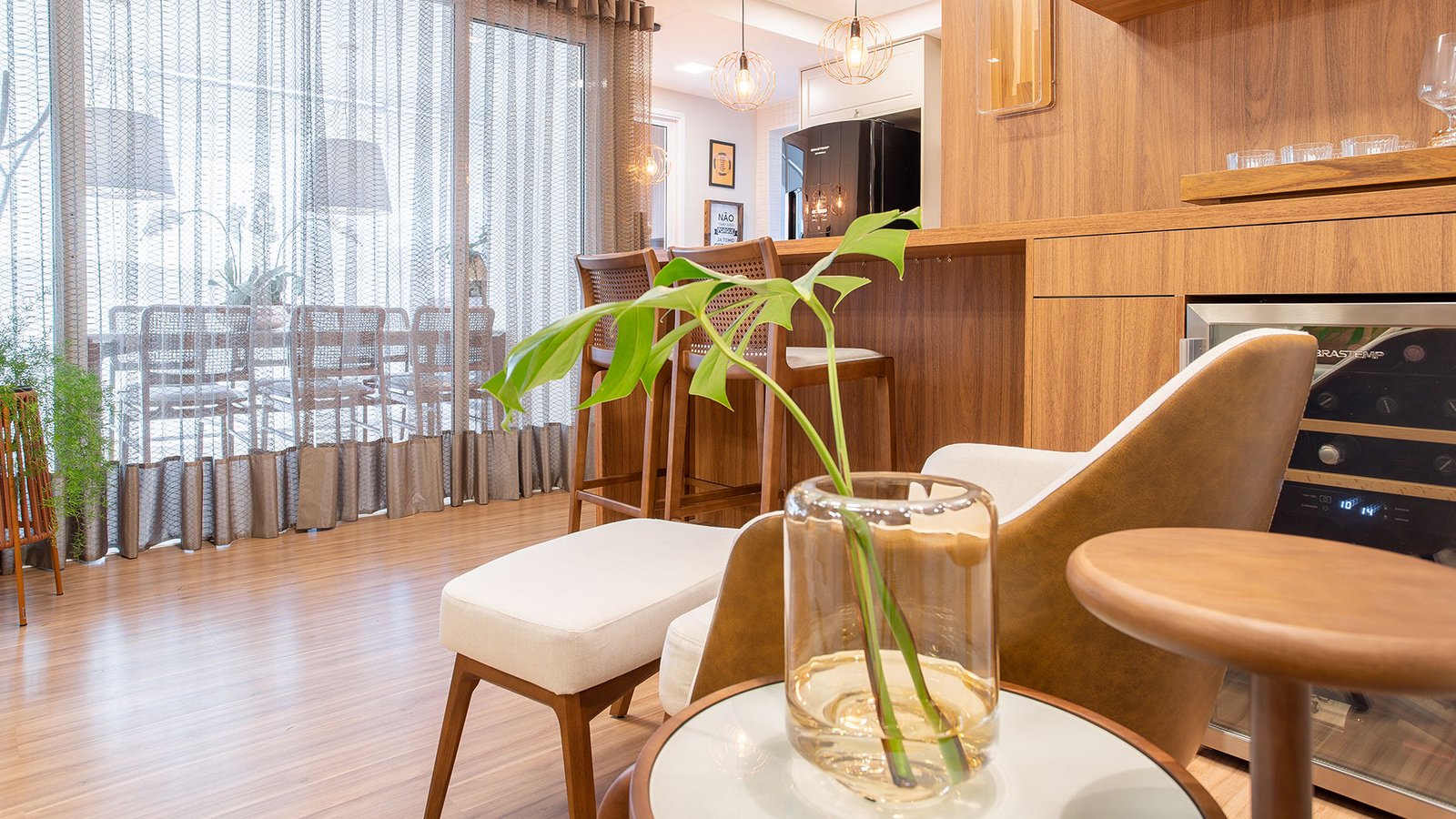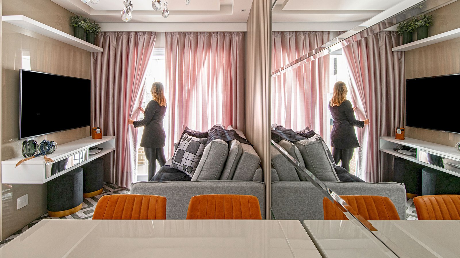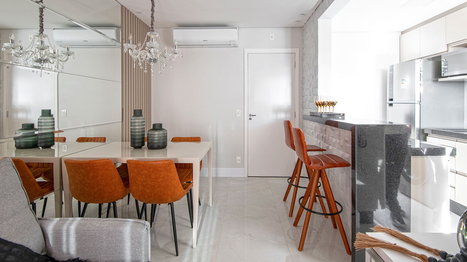 Sala de apartamento com estofados e decorações escolhidos pela designer de interiores Thaísa Soares.