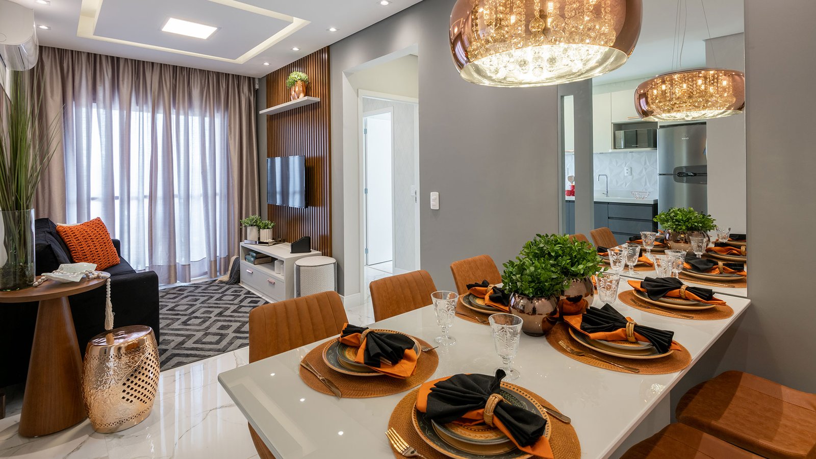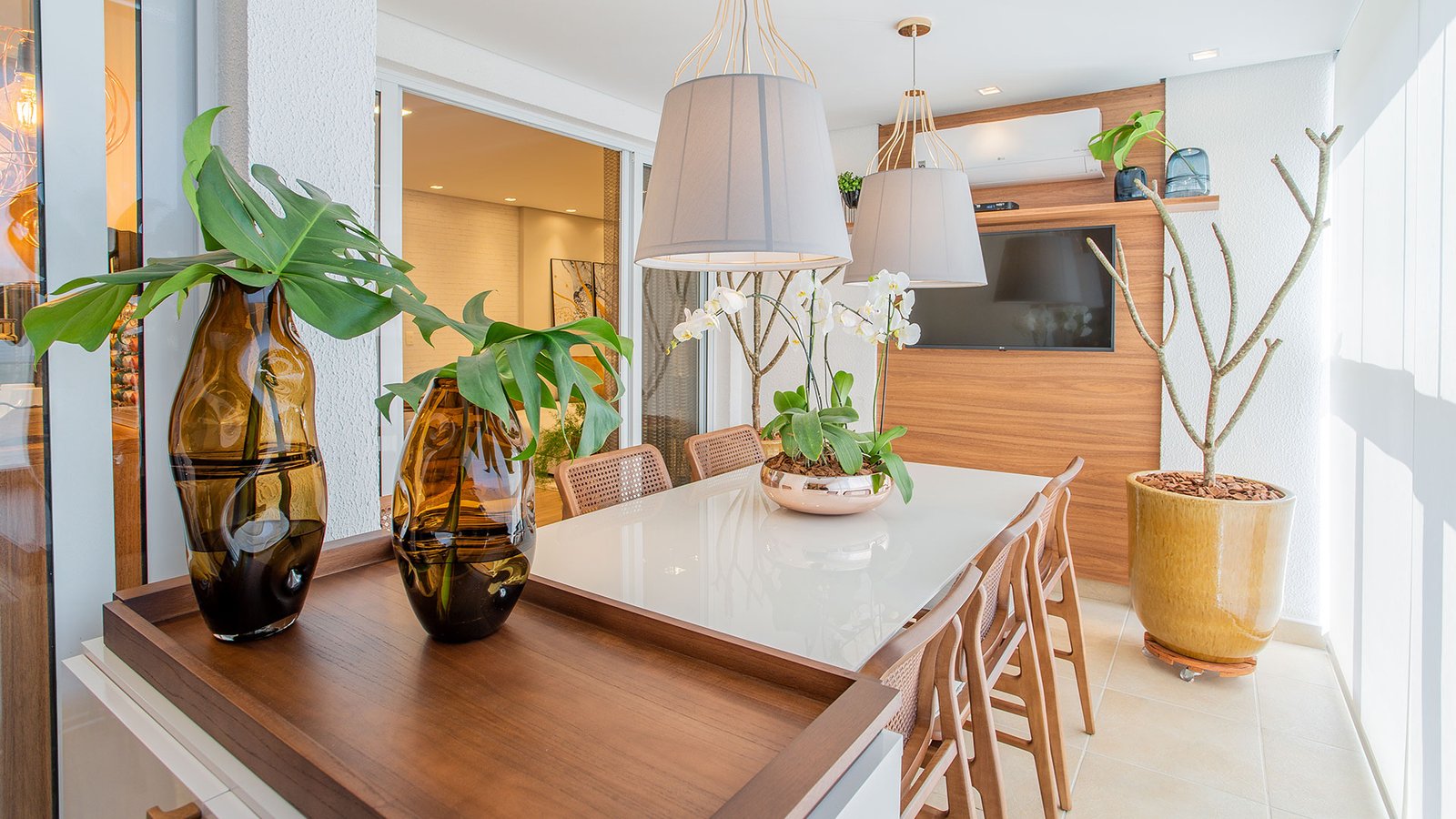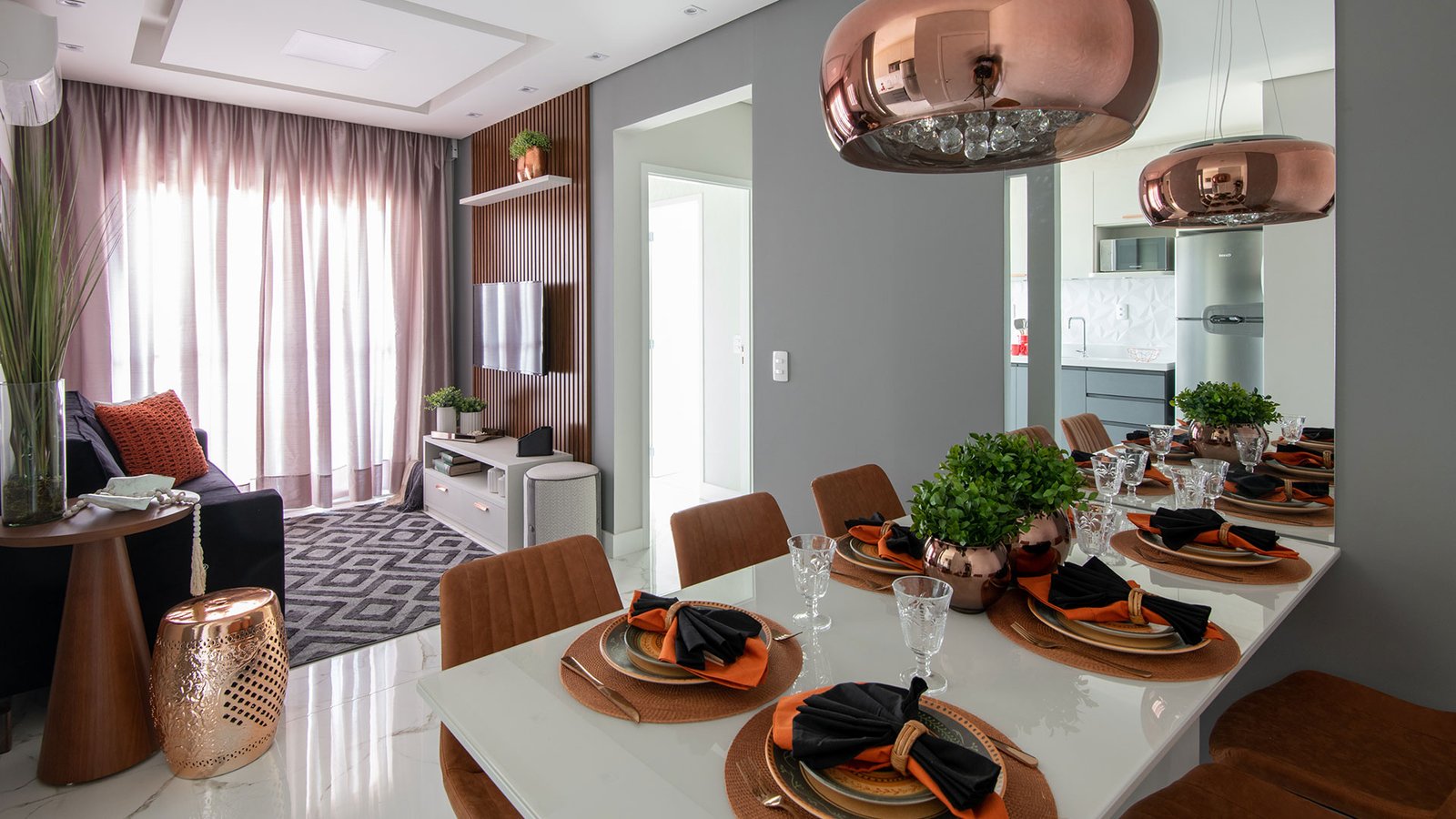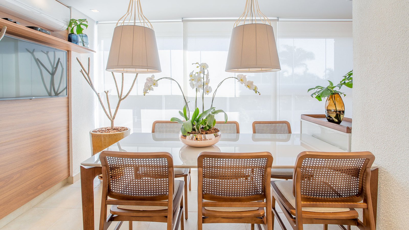 Sala de apartamento com estofados e decorações escolhidos pela designer de interiores Thaísa Soares.