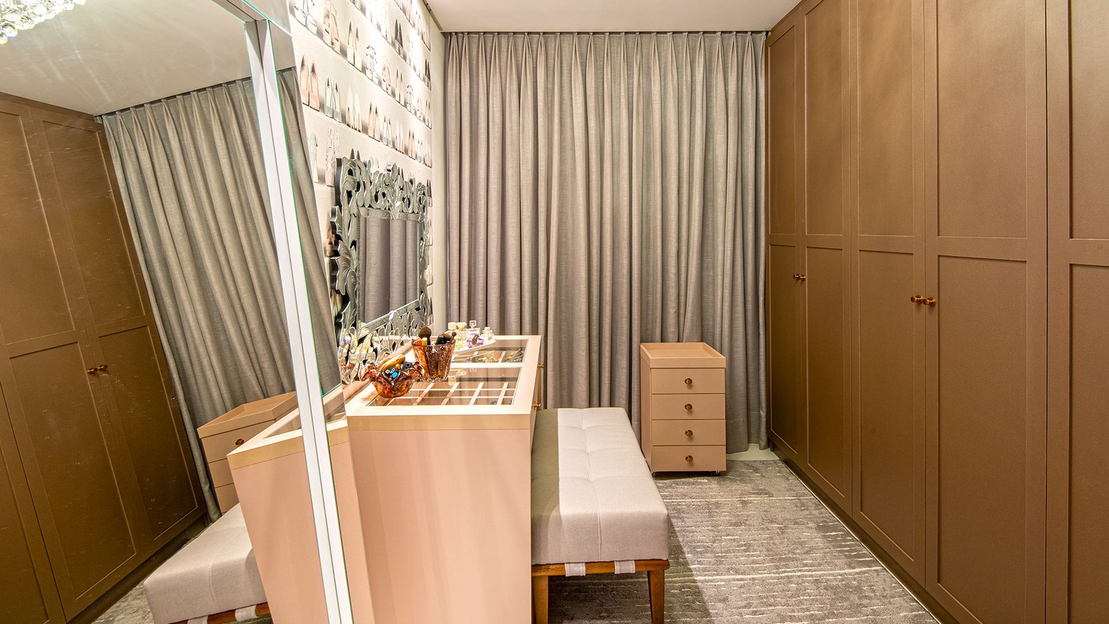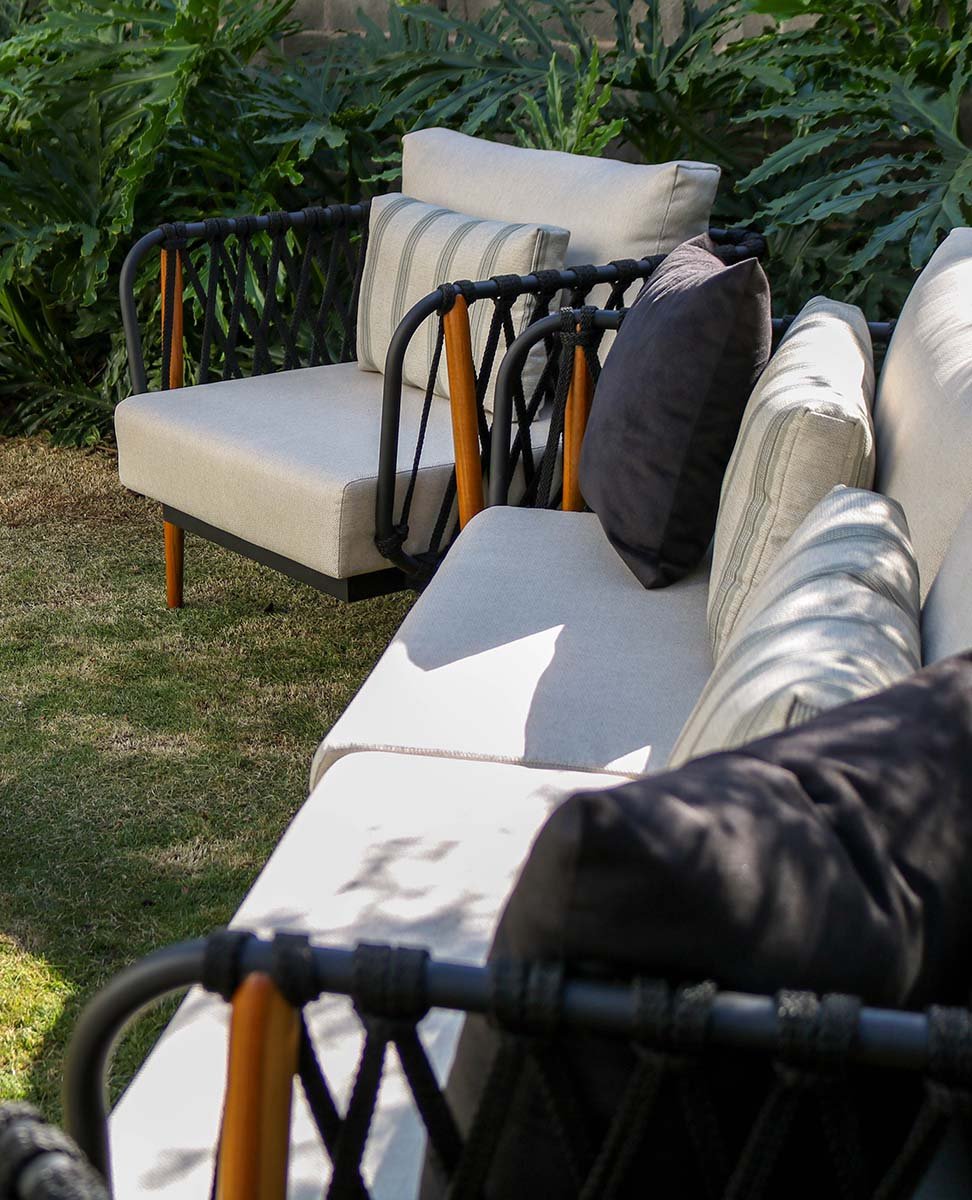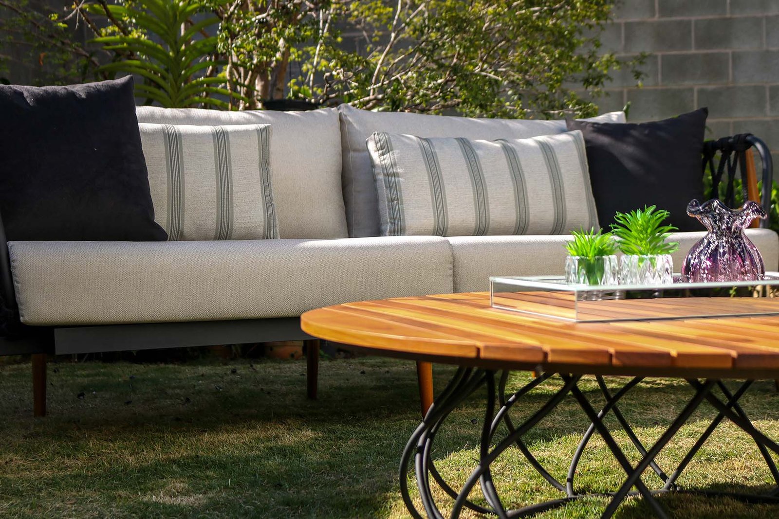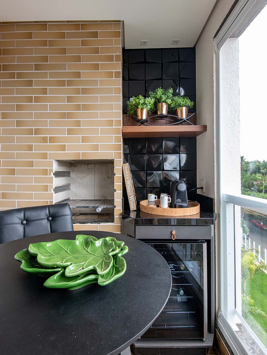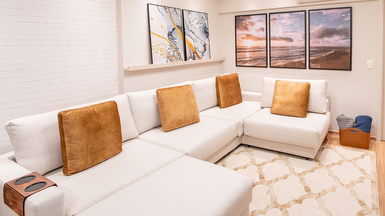 Estofado, almofadas e peças decorativas para hometeather de apartamento. Arquiteta Virgínia Corbini.